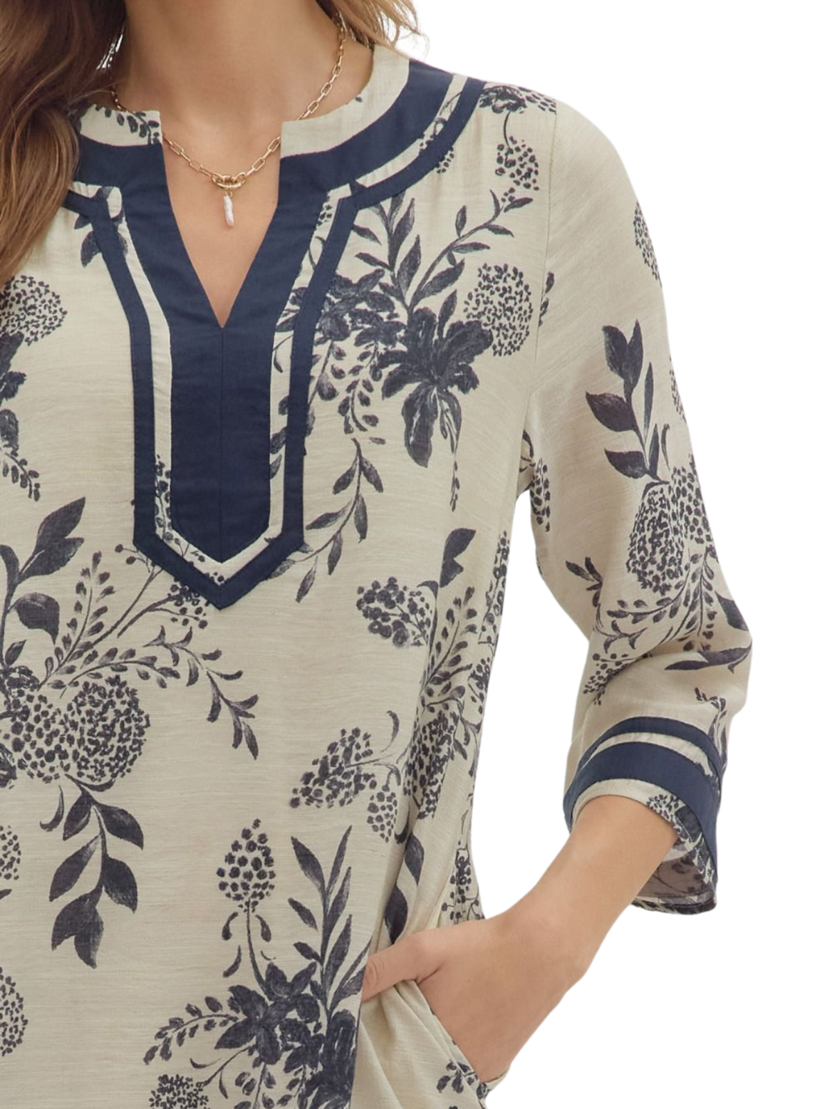 Floral print ¾ sleeve mini dress featuring contrast band border accent. Lined.