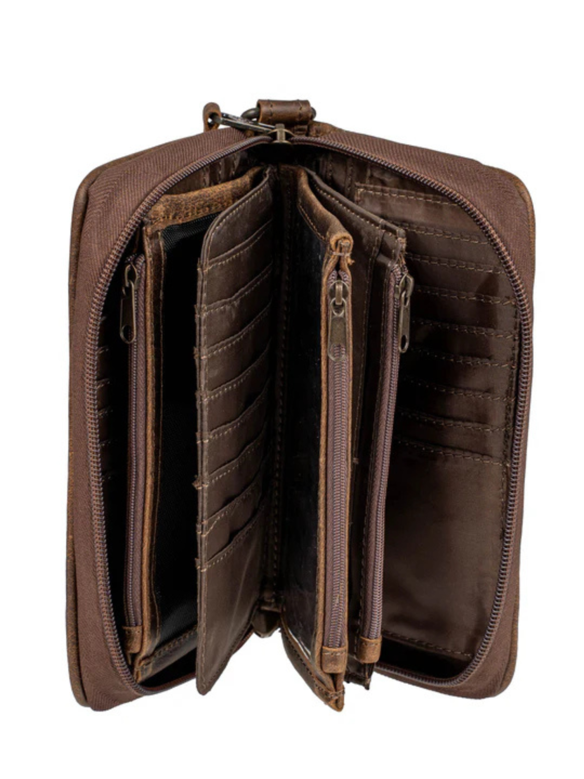 Guadalupe Serape Valley Kacy Organizer from StS Ranch The Guadalupe Serape Magnetic Wallet captures the essence of fall with its rich palette of browns, creams, grays and black colors and is crafted from hand-woven cotton with full grain leather accents for a timeless rustic charm. Handwoven 100% cotton shell with genuine leather accents Zip around closure Removable leather wristlet strap 2 interior zip closure pockets 2 interior photo slots with zip pouch 1 interior mesh divider 1 interior plastic divider Interior card slots 9.75" W x 4.25" H x .5" D