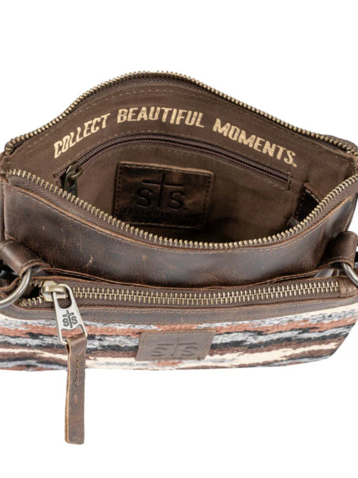 Guadalupe Serape Valley Lily Crossbody from StS Ranch The Guadalupe Serape Lily Crossbody captures the essence of fall with its rich palette of browns, creams, grays and black colors and is crafted from hand-woven cotton with full grain leather accents for a timeless rustic charm Handwoven 100% cotton shell with genuine leather accents Zip top closure Removable & adjustable leather crossbody strap 1 exterior slip pocket 1 interior zip pocketExterior magnetic closure compartment with 1 zip divider pocket, card slots and ID slot Main compartment with 1 zip pocket and 1 scrunch pocket 9" W x 7" H x 2" D