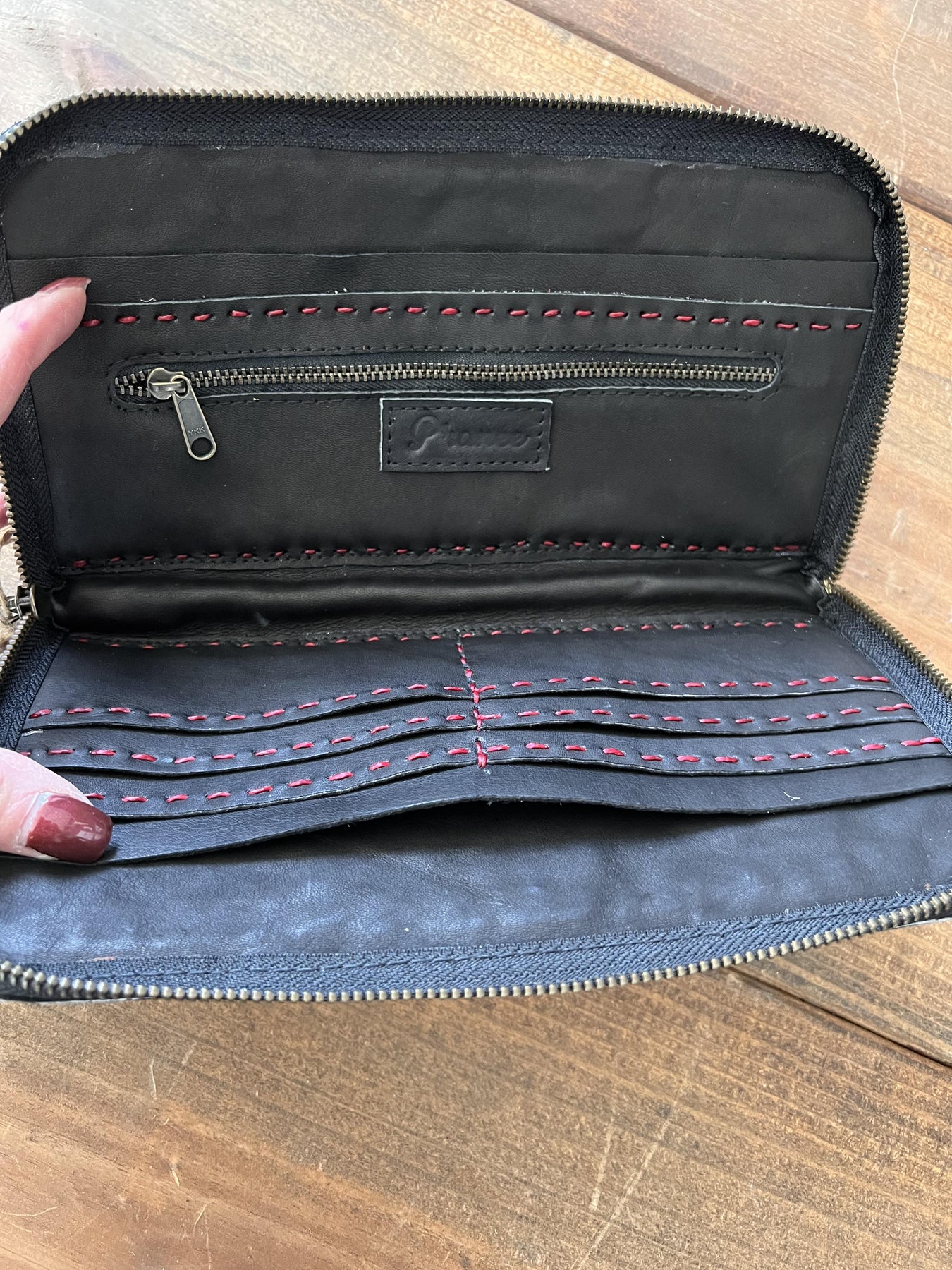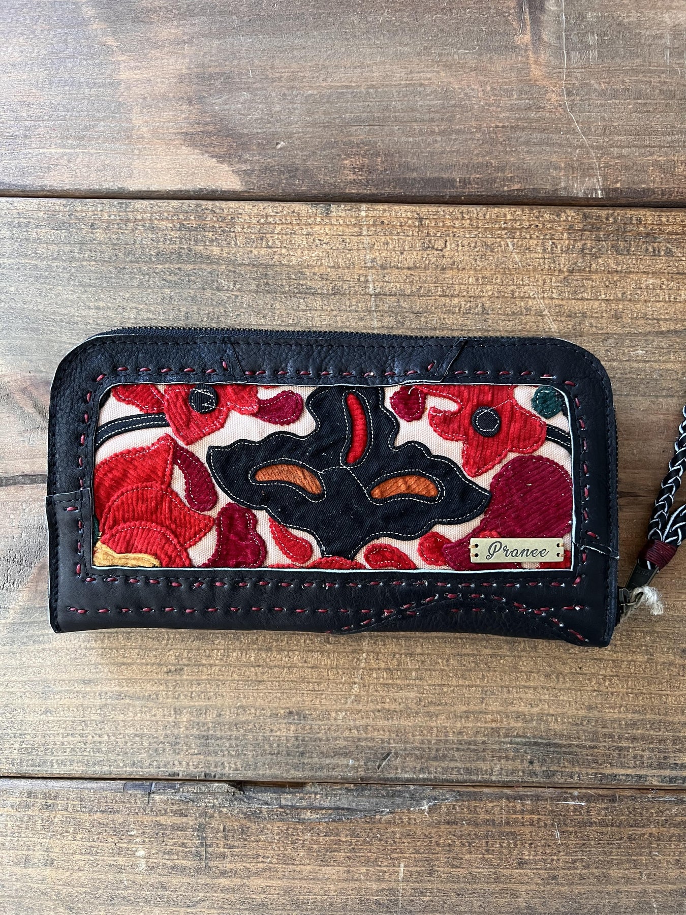 Meet the chic Hudson from Pranee! This little black multi-color number is the perfect mix of tapestry and leather. With a zippered top and braided wristlet, it's both stylish and practical. Featuring interior card slots and zippered pockets, it's perfect for stashing your essentials while running errands. Plus, its compact size makes it easy to drop into a larger travel bag. Made of leather and measuring 5.5x9.5x1", it's a must-have for any fashion-forward traveler.