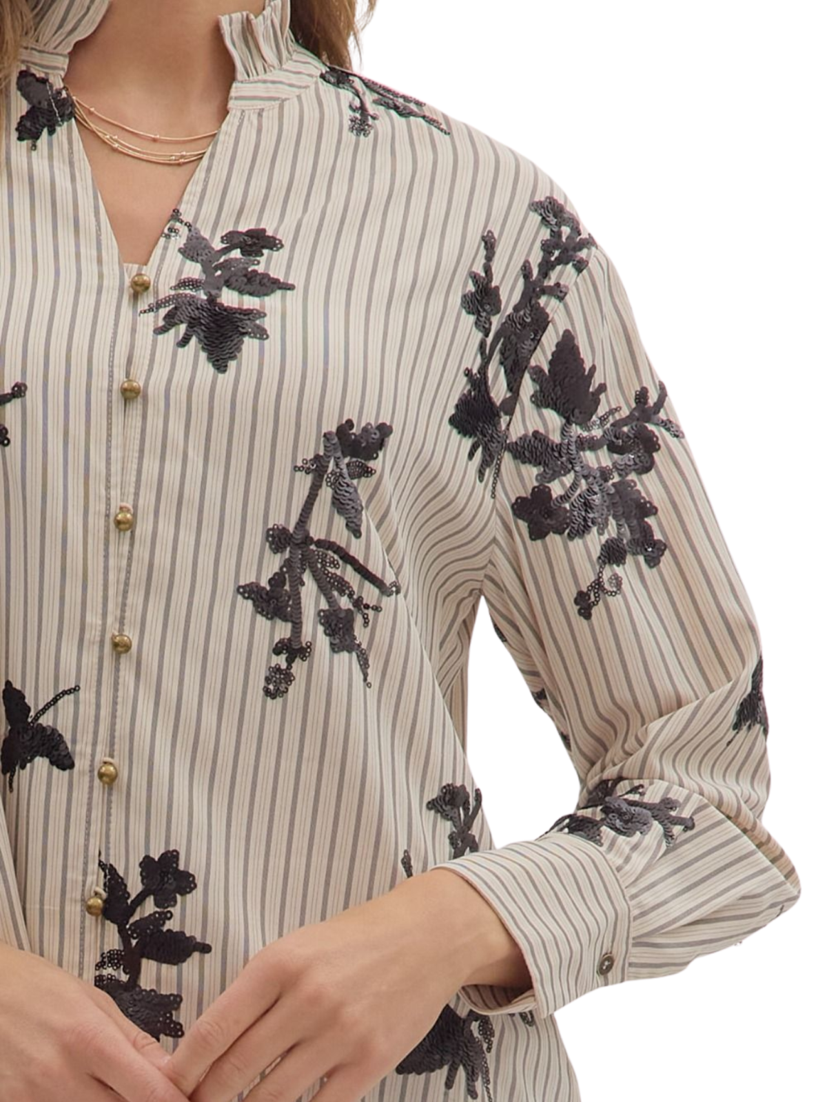 Striped long sleeve top featuring floral applique embroidery and ruffled band collar. Button closure at front. Buttoned cuffs