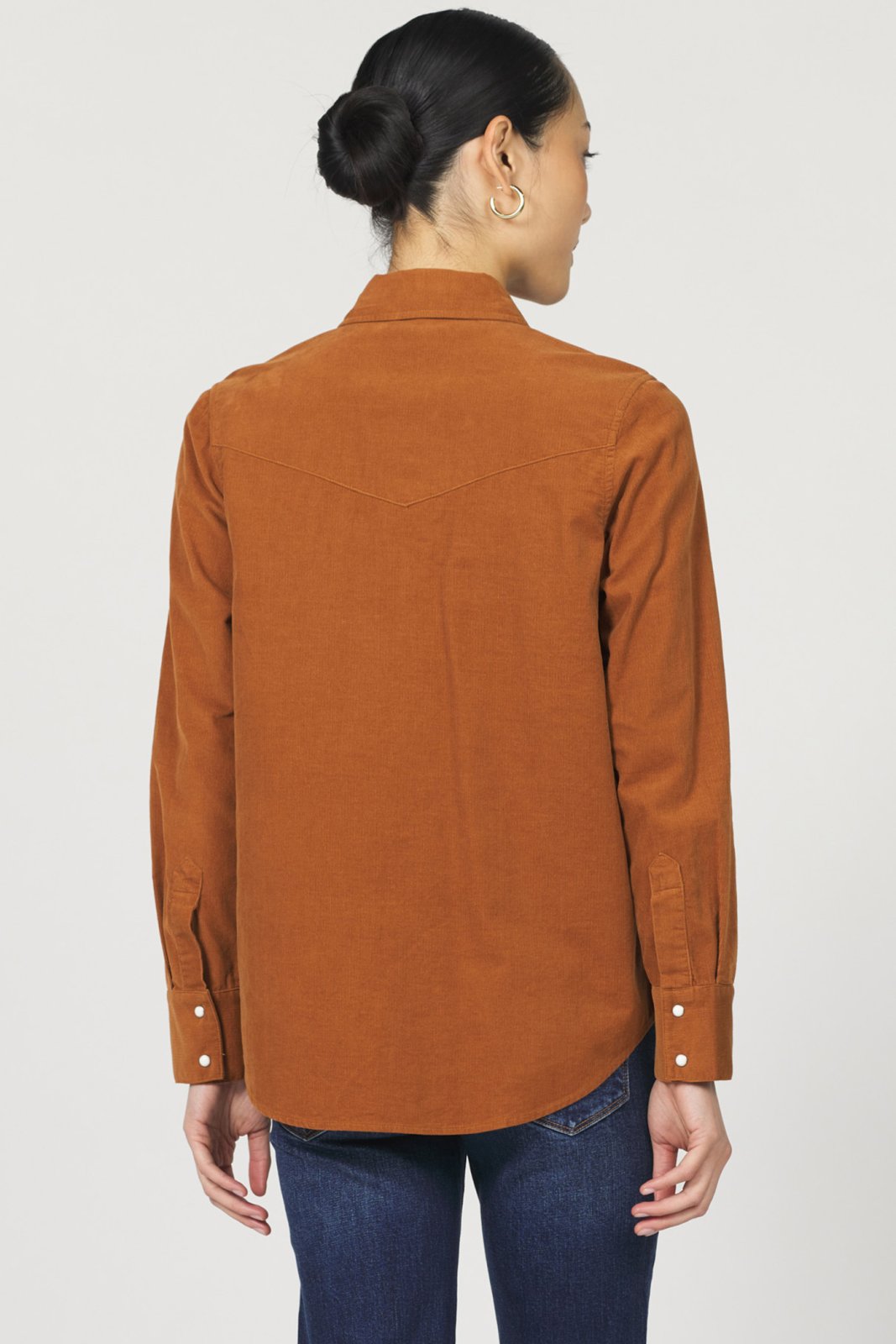 Western style front & back yoke, long sleeve button front placket shirt finished with collar, cuff band & designer detailed front pockets. Lightly washed solid color corduroy twill (non-stretch) for that luxurious soft touch, relaxed fit & styled with marble ring snaps.