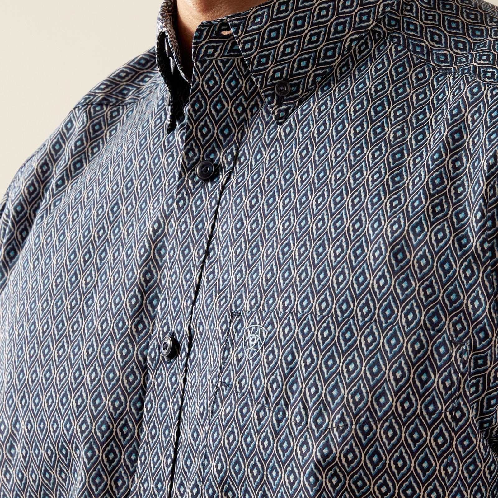 Colson Classic Fit Shirt from Ariat Color: Navy Adjustable cuffs with extended button detail make it easier to roll up your sleeves Hidden pen slot in left pocket Button-front closure with buttoned collar points Ariat® branding details Our most generous fit, with extra length in the body and sleeves that keeps you covered while you're on the move 100% Cotton