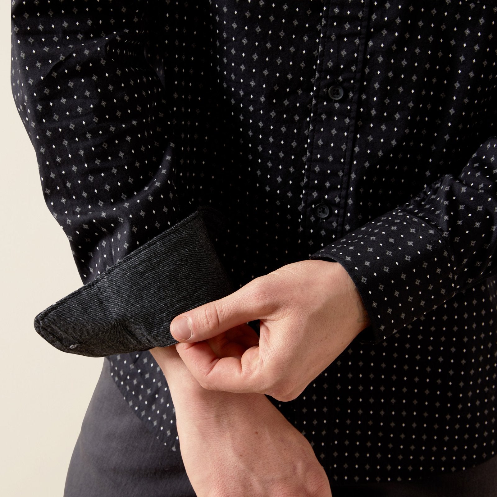 Button-front closure with buttoned collar points Ariat branding details Adjustable cuffs with extended button detail make it easier to roll up your sleeves Hidden pen slot in left pocket 97% Cotton, 3% Elastane
