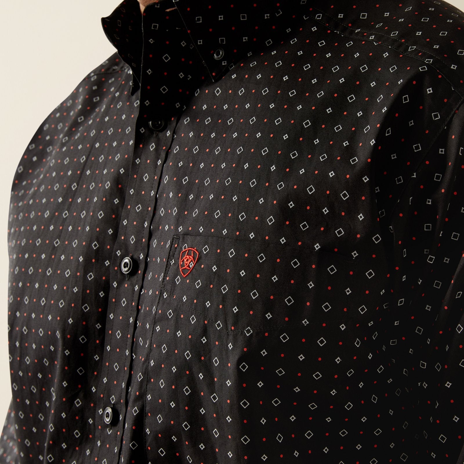 Westbrook Classic Fit Shirt from Ariat Color: Black Adjustable cuffs with extended button detail make it easier to roll up your sleeves Hidden pen slot in left pocket Button-front closure with buttoned collar points Ariat® branding details Our most generous fit, with extra length in the body and sleeves that keeps you covered while you're on the move 100% Cotton