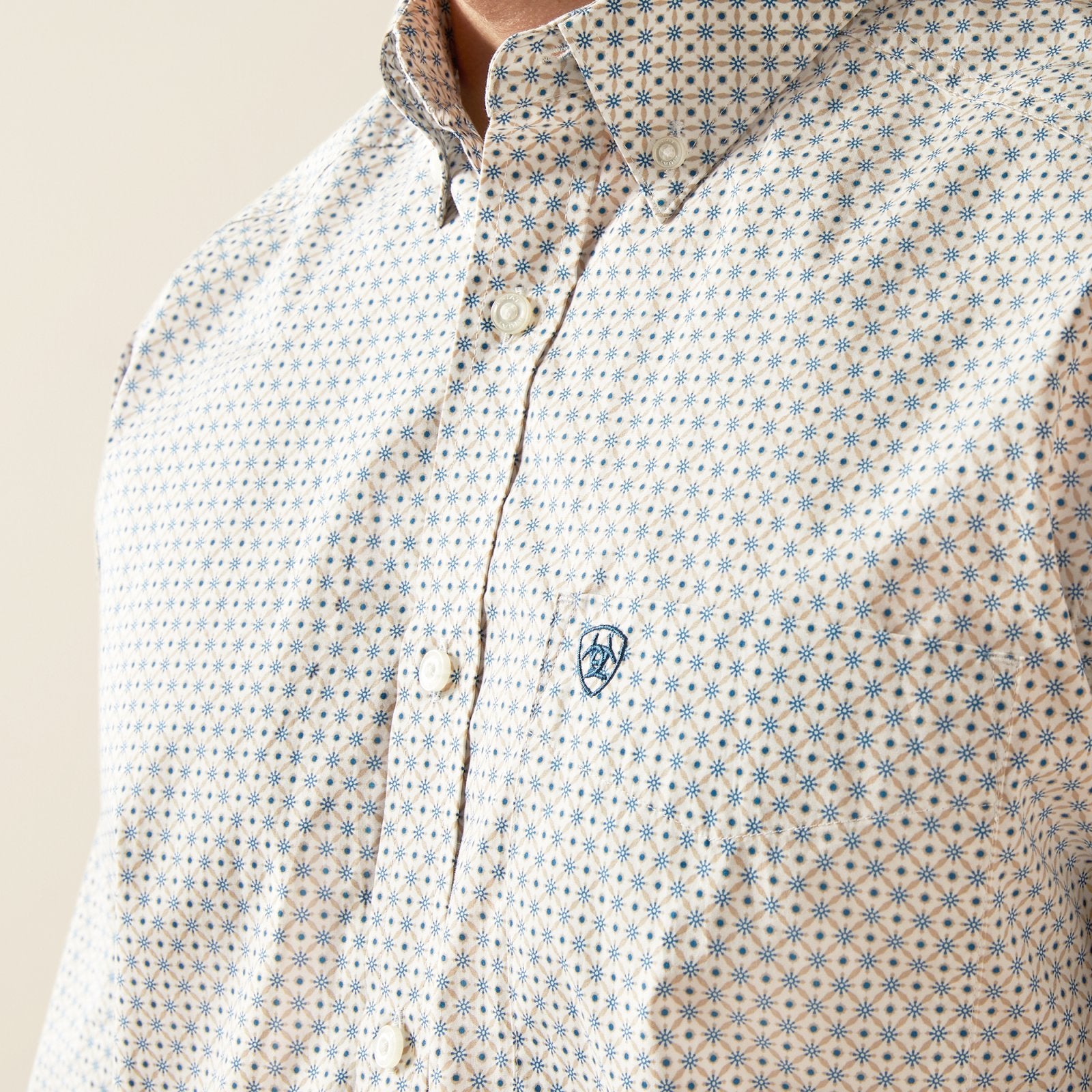 Sutton Classic Fit Shirt from Ariat Color: Khaki Adjustable cuffs with extended button detail make it easier to roll up your sleeves Hidden pen slot in left pocket Button-front closure with buttoned collar points Ariat® branding details Our most generous fit, with extra length in the body and sleeves that keeps you covered while you're on the move 100% Cotton