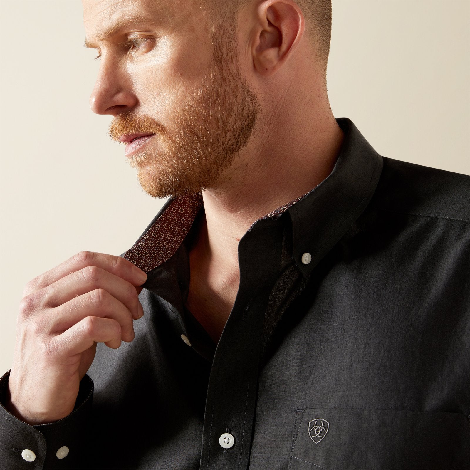 Wrinkle Free Solid Pinpoint Oxford Classic Fit Shirt from Ariat Color: Black Look your best and iron less. Classic, comfortable and long-lasting, our wrinkle-free button-ups look sharp and stay that way. Our most generous fit, with extra length in the body and sleeves that keeps you covered while you're on the move