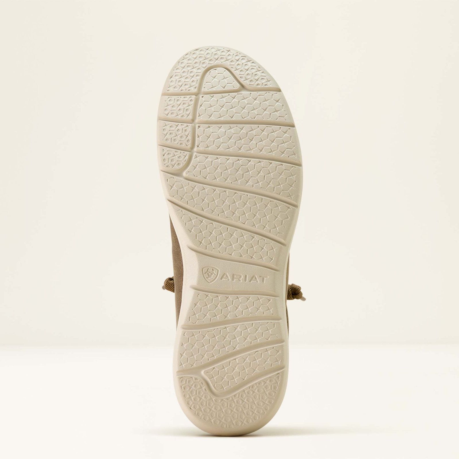 Hilo Mid Shoe from Ariat Color: Bomber Brown All the feature you love about the Hilo - now a mid Open cell cushioning insole FLX Foam™ sole has a light springy feel that cushions each step Elasticized laces By purchasing this product you are supporting the responsible production of leather at Leather Working Group-certified tanneries 4" shaft height Moc toe leather upper Mesh lining
