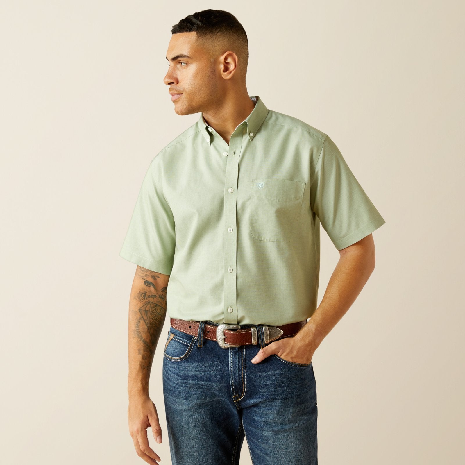 Wrinkle Free Solid Classic Fit Shirt from Ariat Color: Green Aqua Wrinkle free finish combined with taped seams for added protection against wrinkles Adjustable cuffs with extended button detail make it easier to roll up your sleeves Button-front closure with buttoned collar points Ariat® branding details Hidden pen slot in left pocket Our most generous fit, with extra length in the body and sleeves that keeps you covered while you're on the move 100% Cotton