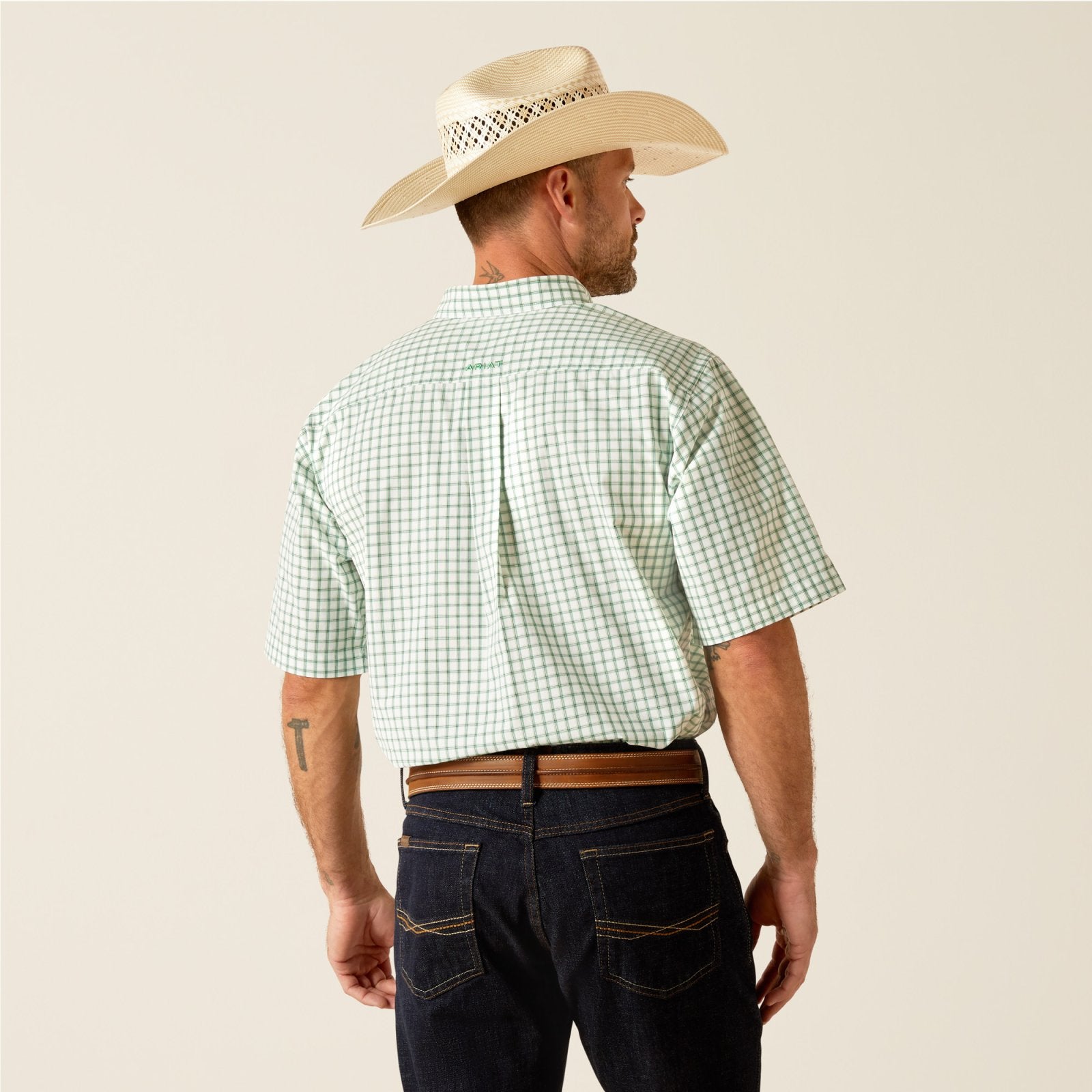 Pro Series Damian Classic Fit Shirt from Ariat Color: White/Green Breathable & durable fabric that can handle anything your put it through Sun protection Moisture movement technology Greater arm mobility Breathable mesh yoke Taped placket & neck seam 82% Cotton 18% Recycled Polyester
