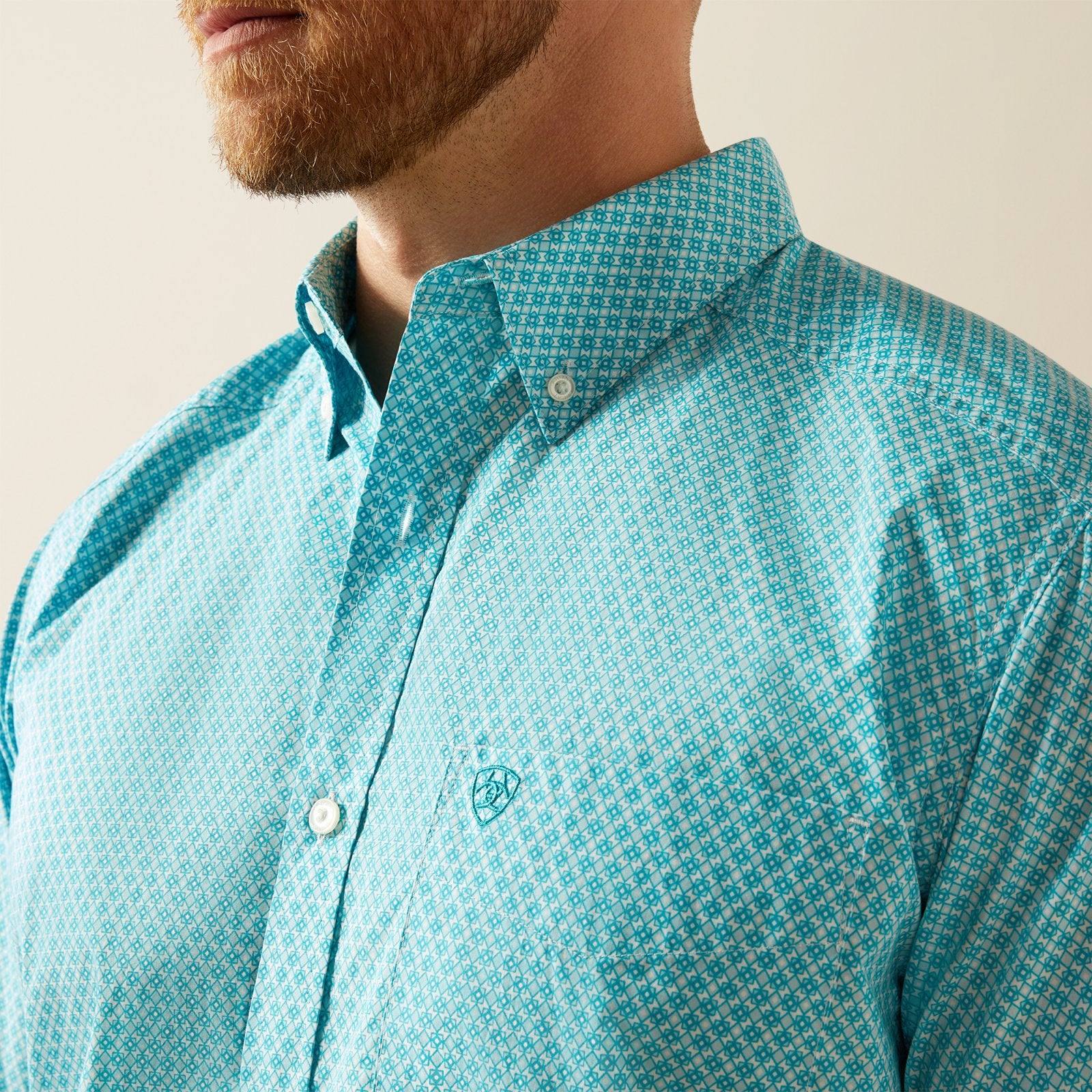 Westin Classic Fit Shirt from Ariat Color: Light Blue Adjustable cuffs with extended button detail make it easier to roll up your sleeves Hidden pen slot in left pocket Button-front closure with buttoned collar points Ariat® branding details Our most generous fit, with extra length in the body and sleeves that keeps you covered while you're on the move 100% Cotton