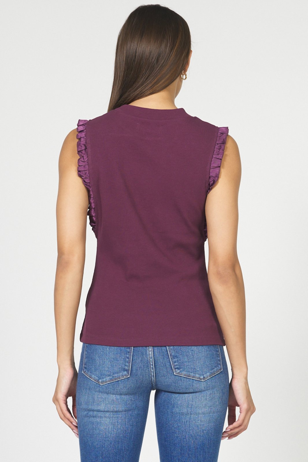 Bridgette from Dear JohnColor: FigA soft ruffle trimmed tank you can wear year around!Crew necklineKnit fabricPanel insert in arm opening to keep it modest52% Viscose 48% Rayon