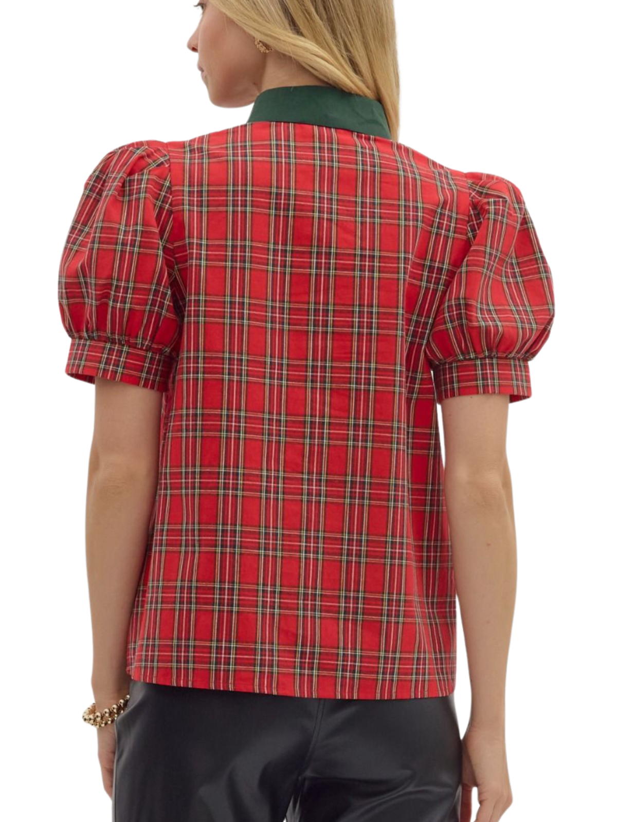 Plaid pattern cuff band short sleeve top featuring contrast accent caftan-inspired V-neck band. Unlined.