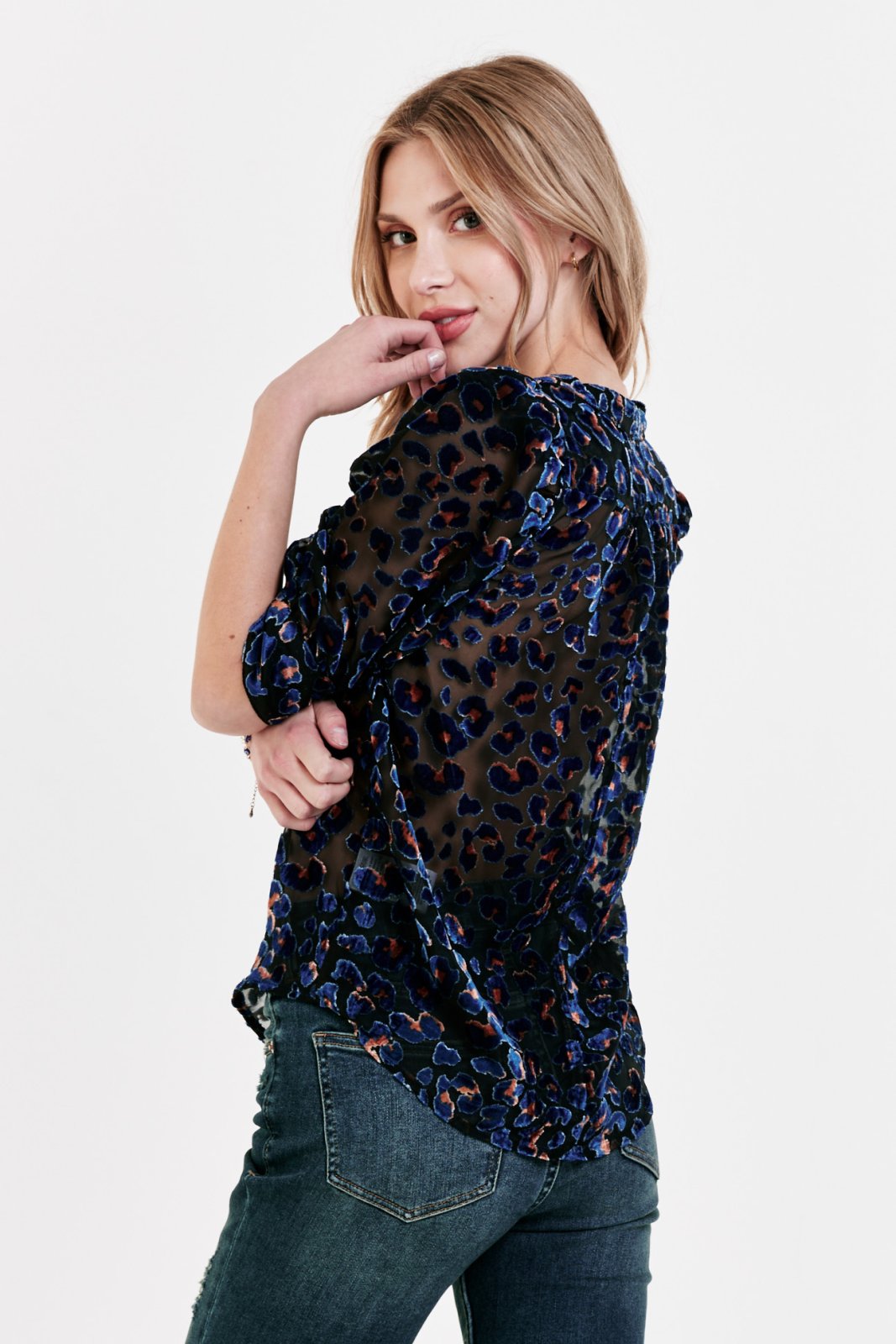 Rowan from Dear JohnColor: Blue SpotsVelvet styled burnout topGathered short sleeve with button frontShort banded collarSheer80% Viscose 20% Nylon