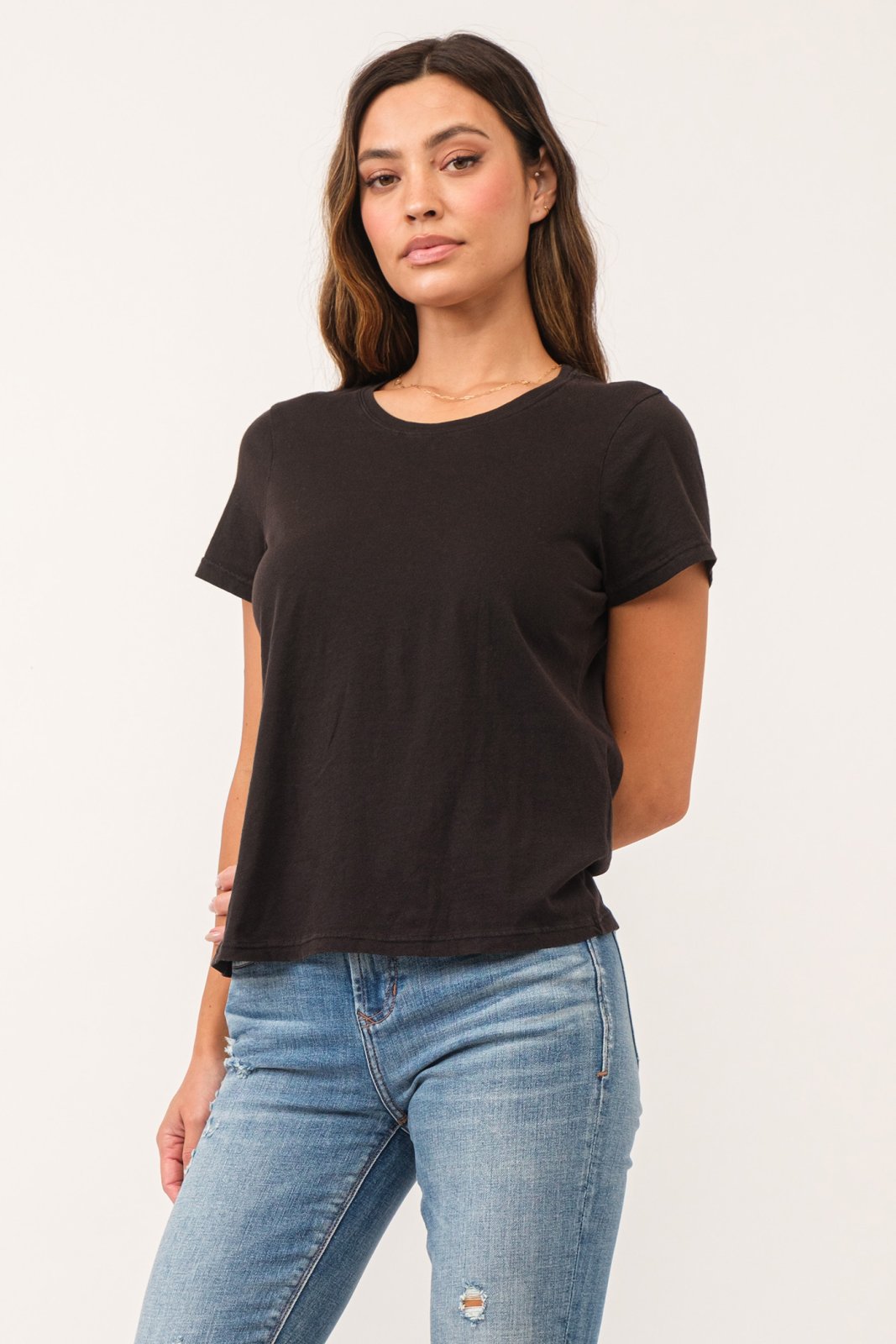 Unity from Dear John Color: Black Embracing timeless elegance with the UNITY top in designer colors, featuring a crew neck and short sleeves in a classic fit, crafted from 100% cotton for unparalleled comfort and breathability. This essential piece seamlessly pairs style with unmatched versatility, making it a staple in any wardrobe with comfort.