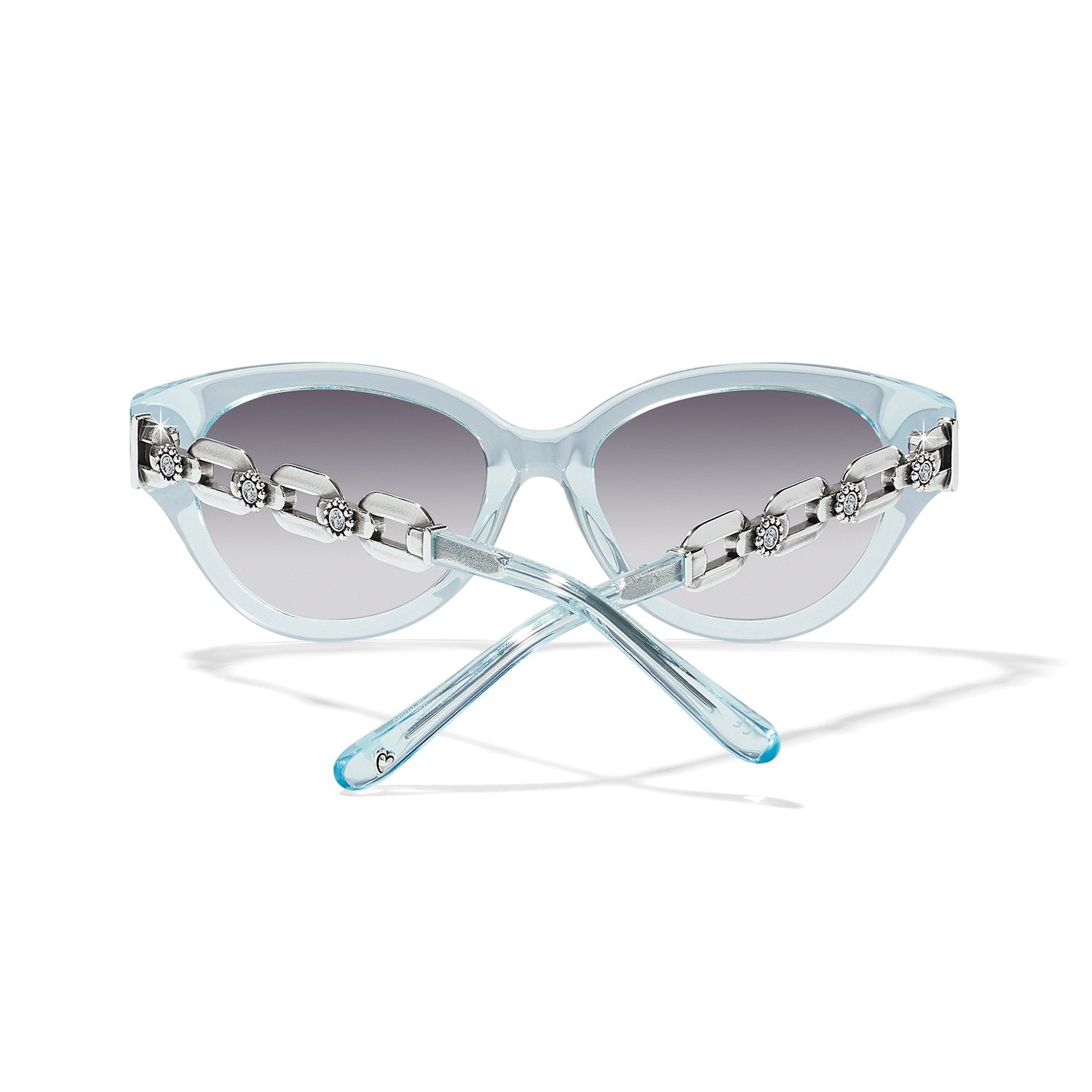 Twinkle Chain Sunglasses from Brighton Color: Ocean Water This flattering new shape is an oval with a cat eye feel - super feminine and fun. The temple is a modern and bold link design adorned with the classic "Twinkle" crystal design on the smaller links. Its "Ocean Water" color is a transparent pale blue shade that is soft on the face, easy-on-the-eyes, and super on-trend