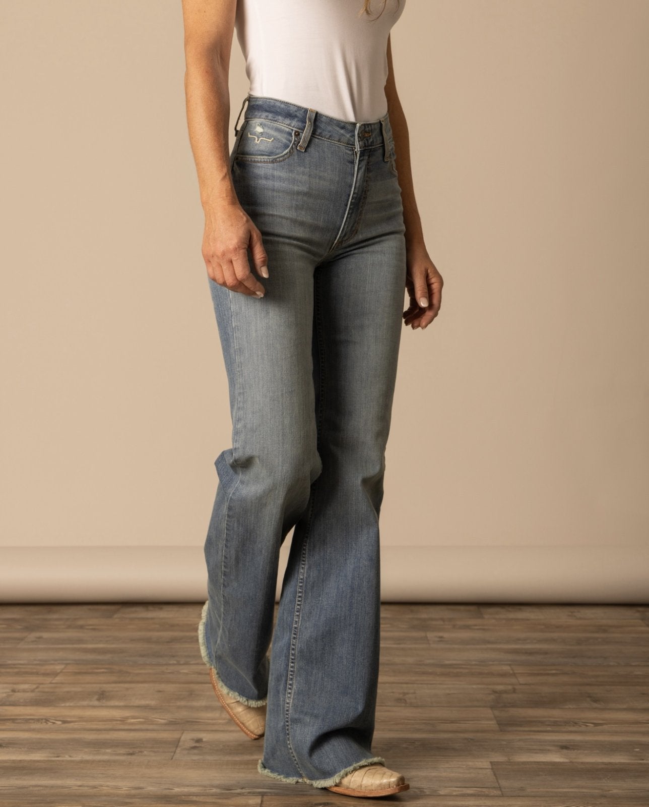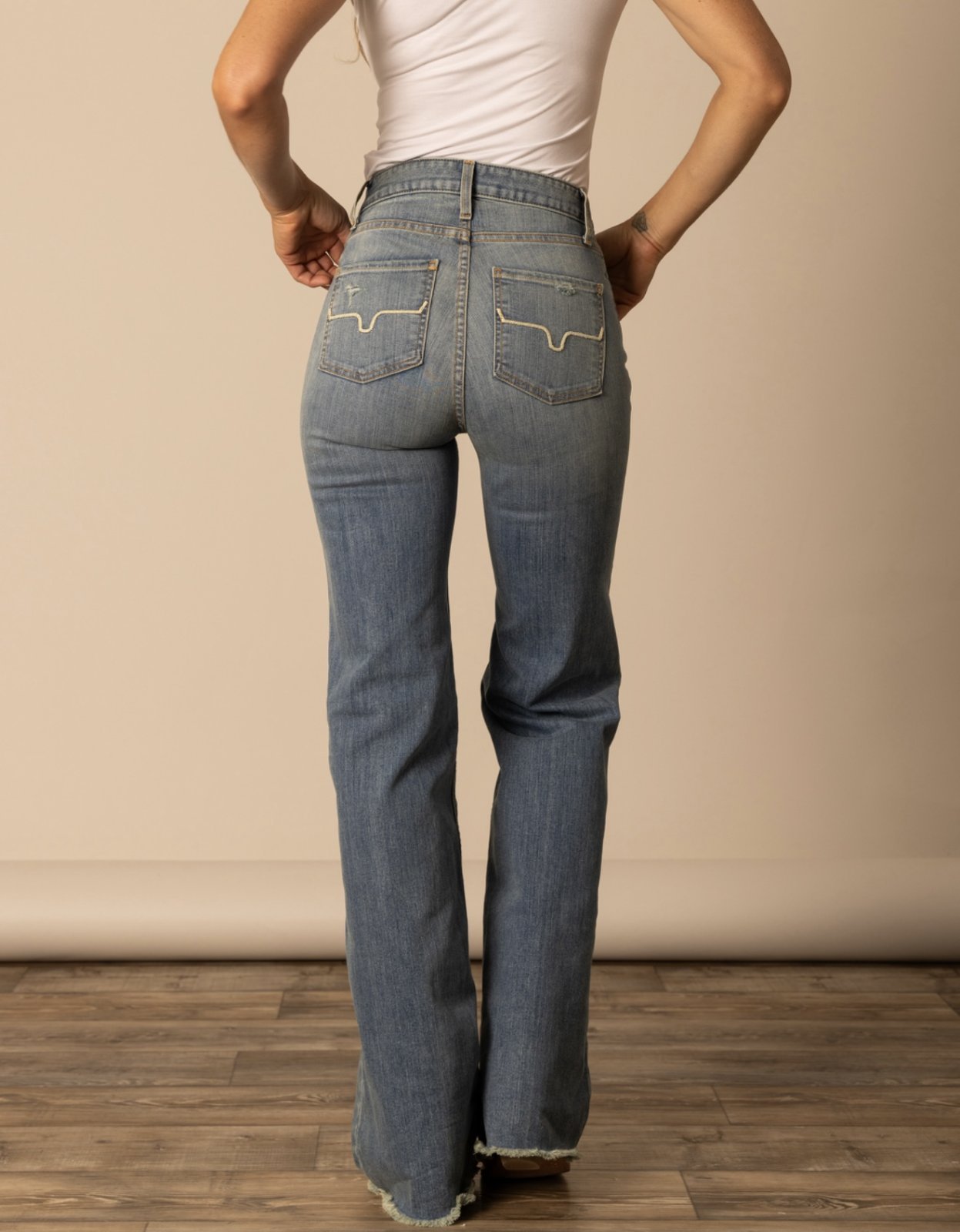 A high-rise stovepipe jean with a wide leg and raw hem, the Olivia is the perfect everyday jean. Made from our innovative tri-blend denim for maximum wearability and rebound, this lightweight jean is accented with our iconic Longhorn logo on both back pockets.