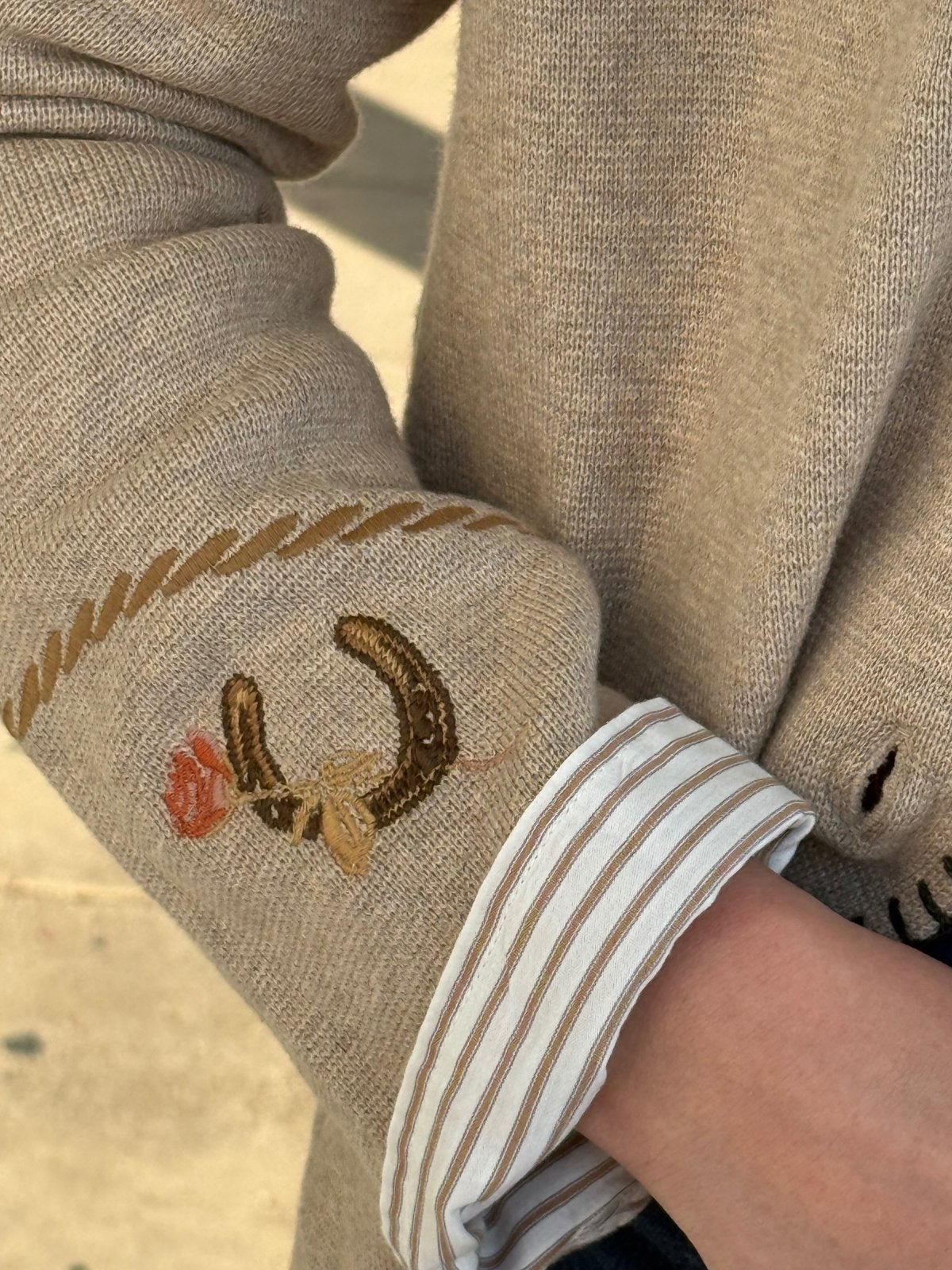 Embroidery details on sleeve and back of sweater